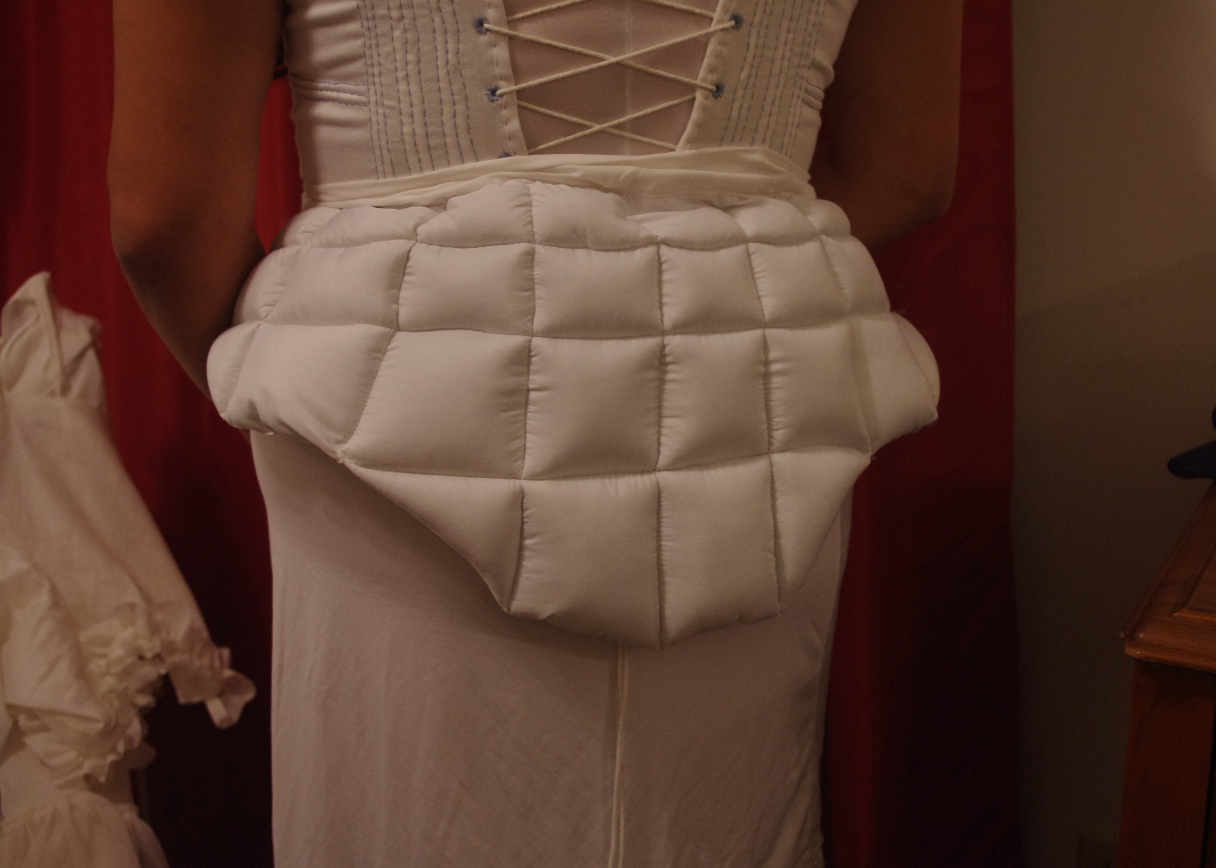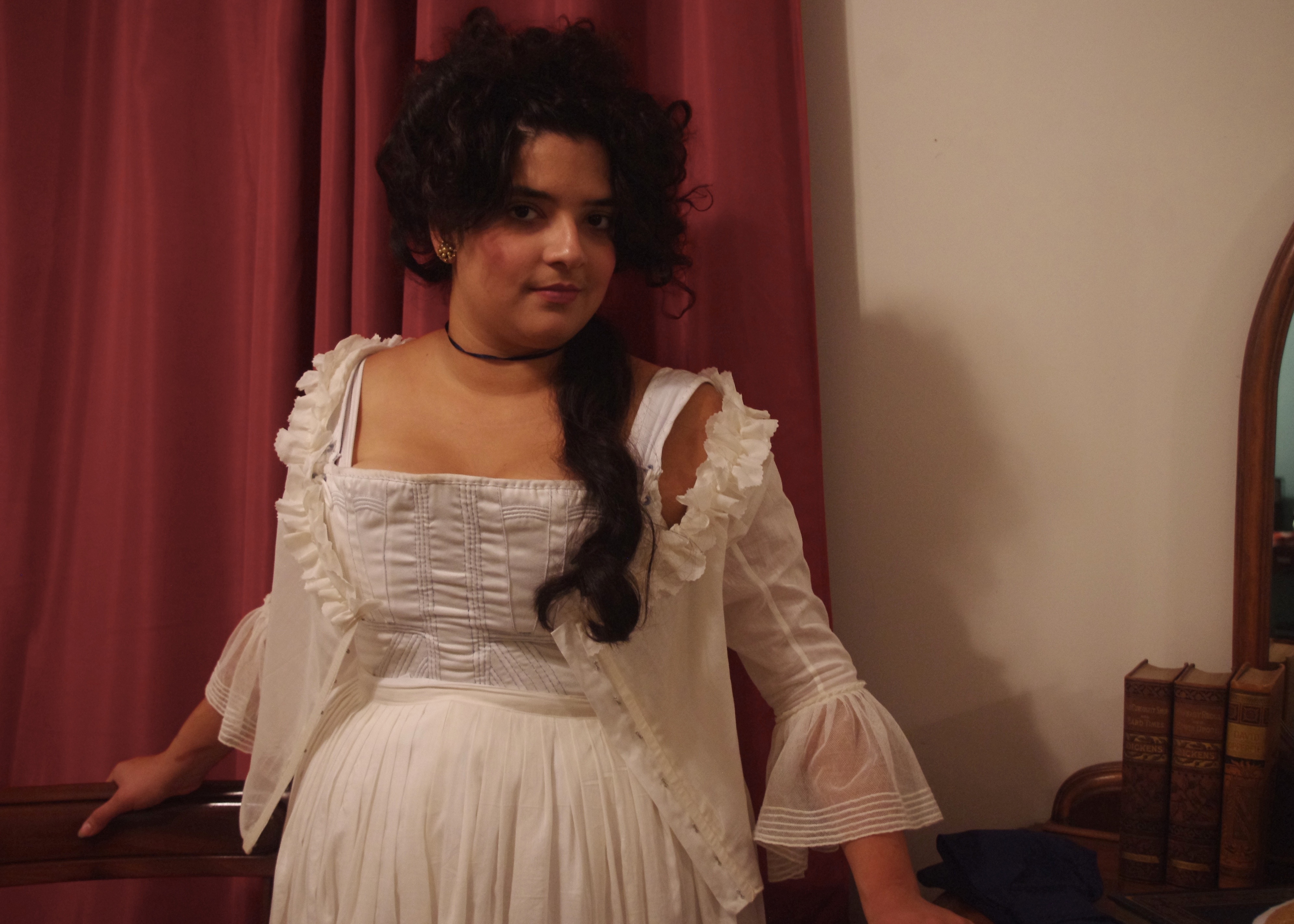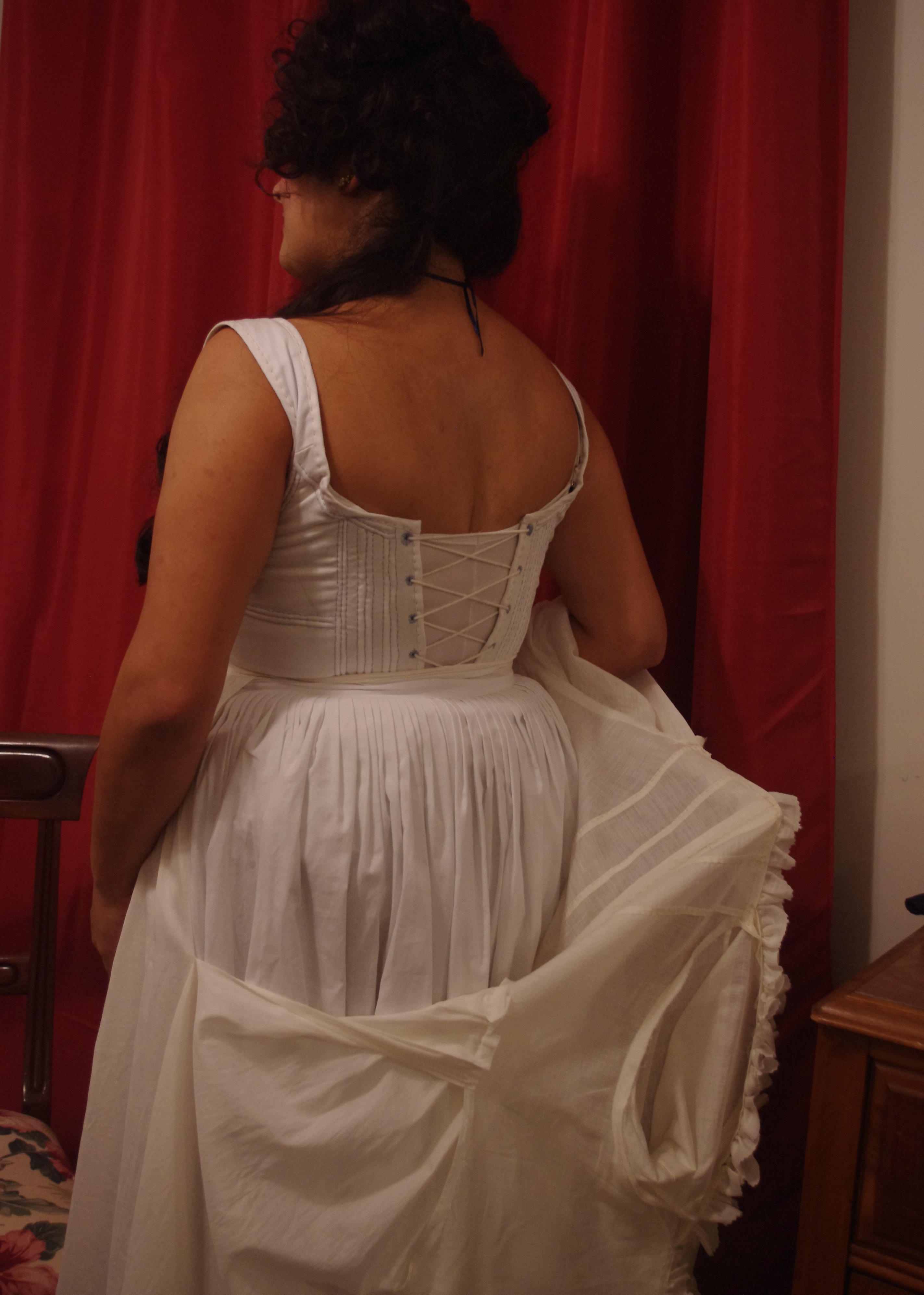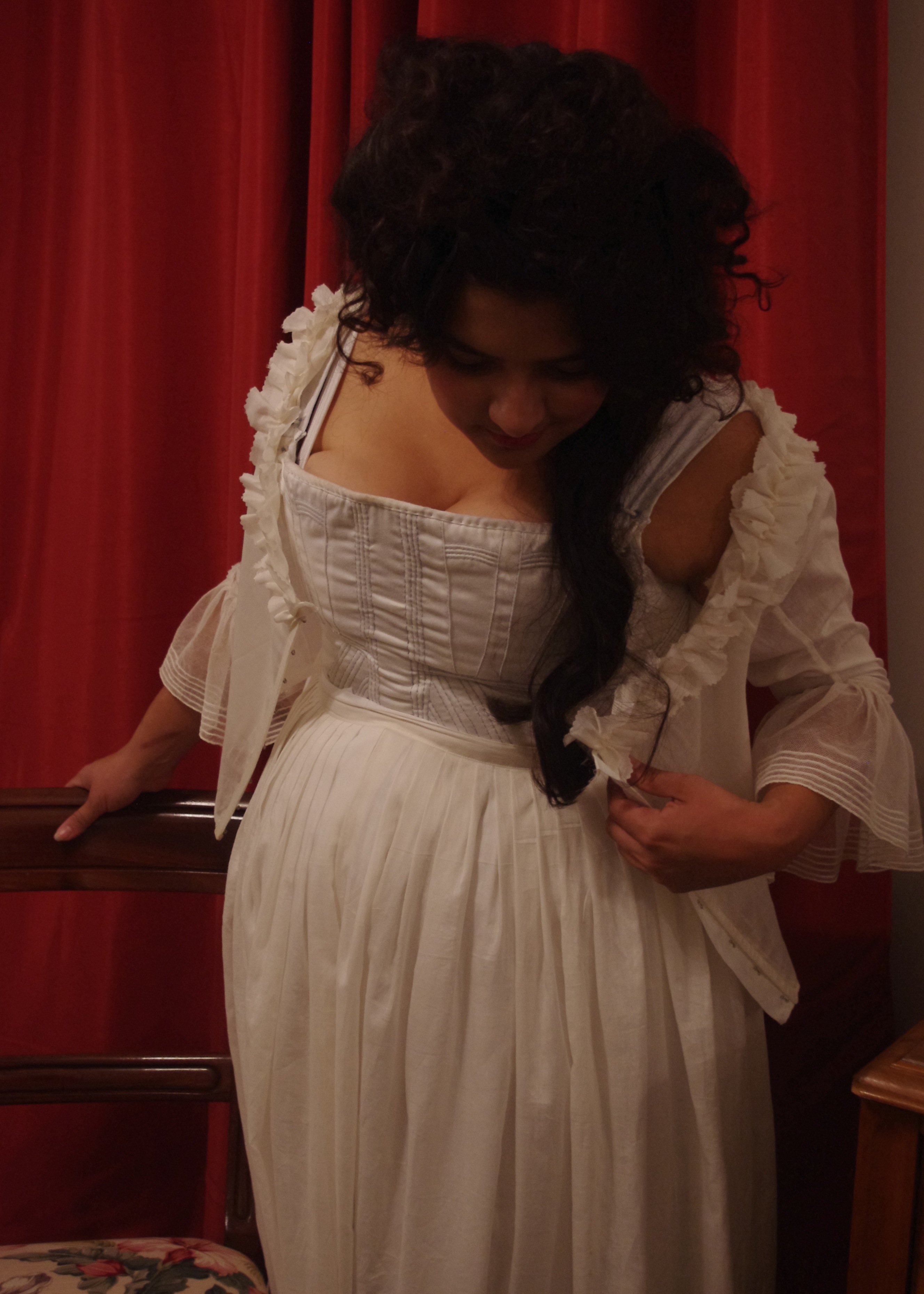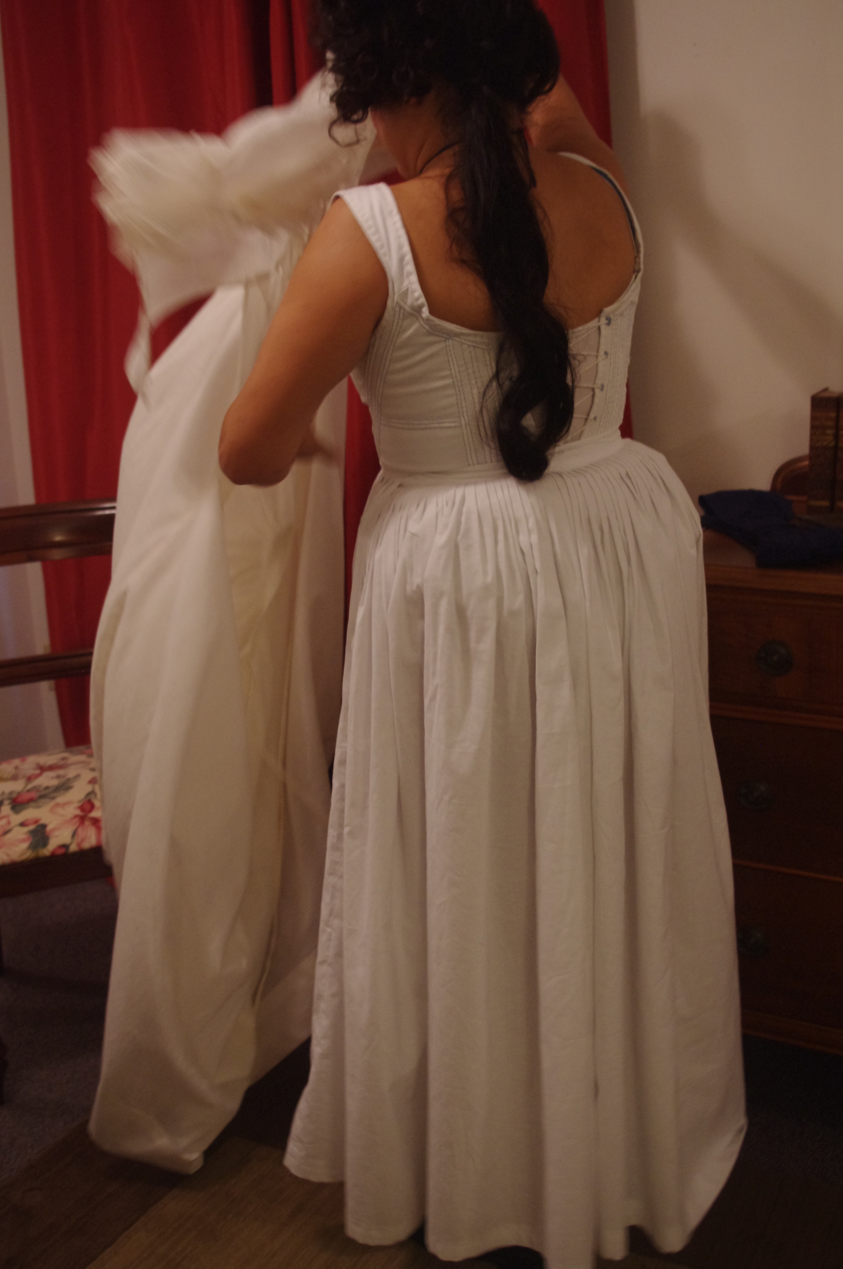 In addition to my photos of my HSM Challenge 6 outfit we took photos of me getting undressed and showing you the layers. Excuse my lack of a historical chemise and I haven’t gotten around to making pockets yet. Here are the photos you can look back at my last post to see more of the background and construction information.