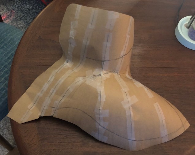 My main fabrics are hot rolled rayon/cotton moiré. I used a synthetic chiffon for the under dress. The corset pieces are fused to washed cotton coutil using wonder under. To pattern the corset I used a basic corset block that fit me well and cut all the pieces out of stiff brown paper with no seam allowance. I carefully taped the pieces together to create one half corset. I then sketched out my lines to mimic the arched forms on the Singing Tower. Once the pieces were cut out I traced them on the fresh paper and trued my curves adding 1/4″ seam allowance. The corset self was then sewn together on my trust Singer Featherweight 221. The tricky part was making a corset with no visible boning. The lining has 16 bones placed in between the layers. I then flatted the lining to the self at the top and bottom edge after setting in my busk placket and clean finishing my center back. Once the two layer were secured I stitched in the ditch in all my seams starting and stoping after each bone. There are still some wrinkles but the smooth effect was worth it. There is one visible stitch line behind the grommets that was a necessary concession. The tea gown was made using a heavily altered Truly Victorian pattern. I drafted the sleeves, belt, and the collar and cuffs to match the Watteau pleats. The matching underdress was made from 2 layers of French seamed chiffon and has interior elastic to keep it snug to the body but not visibly fitted. The construction was all about using hidden elements to support the visible design.