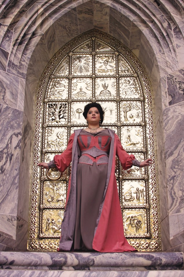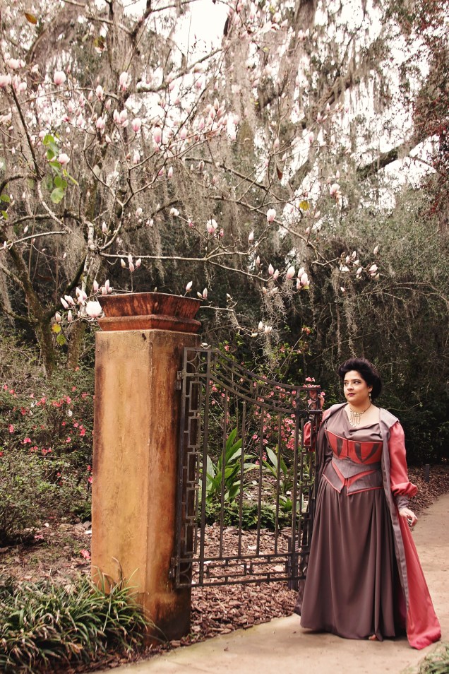 I took inspiration from the repeated arches and strong graphic lines of the Tower. The of pink Etowah marble and gray Creole marble inspired my choice of textile. The main silhouette was taken from Edwardian home wear, Bok is credited with the invention of the idea of the modern living room. The tea town was an informal garment worm when entertaining in the home. The corset would never show of course but I was going for historically inspired not historically accurate. Overall I wanted the final look to reflect the Southern Gothic gardens.